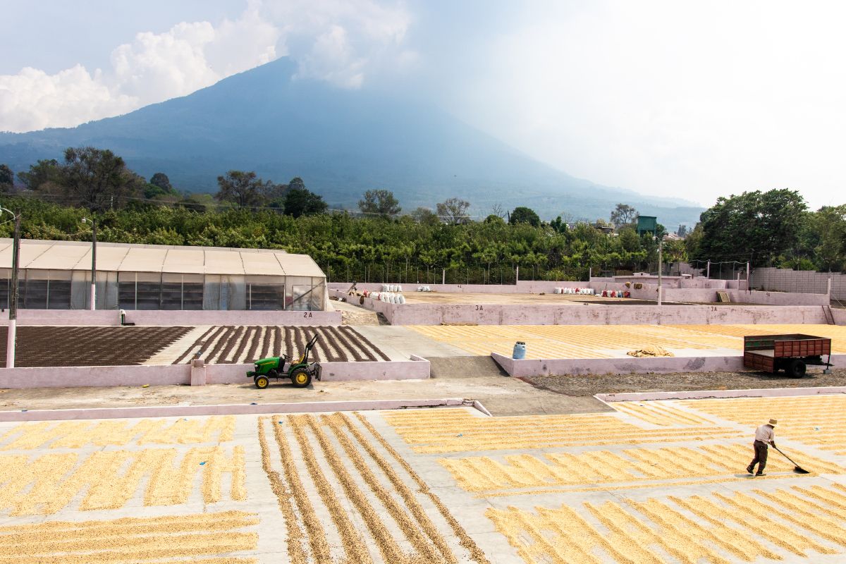 The microlot we selected and purchased during our annual January visit comes from traditional Bourbon coffee trees. The cherries are taken to the Bella Vista factory, located on the outskirts of Antigua, each day after harvest. The cherries first go into the peelers, then ferment in concrete fermentation tanks for 24 hours. Subsequent drying takes place in the Bella Vista factory's concrete patios overlooking the Agua volcano, and simultaneously on "African beds" in covered drying rooms.